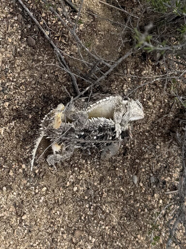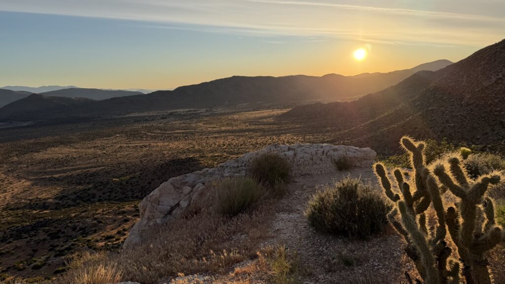 2 miles in, I find a cold rock to sit on. The stars twinkle as I eat my first breakfast, leftovers from last nights dinner. In the darkness, I see a tarantula pop out of his hole. He sits there motionless, talking to me. “Hello,” he says. “Hey buddy,” I say. 3 bites later and he pops back into his hole. 3 more bites later, I pack up and leave my friend. The desert will bring him riches in the coming day.