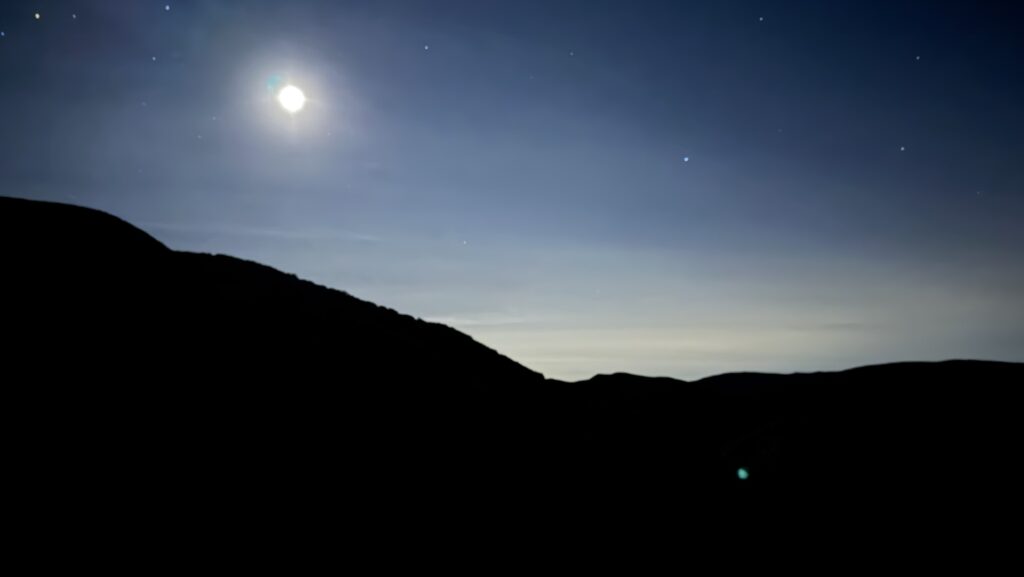 My blood coagulates into a blood booger at the back of my nose as I breathe the dry desert air. With swiftness, I descend down the steep, rocky terrain. The cold moon is a welcoming stark contrast to the hot days of sunlight. I slip and catch myself from falling into the darkness below the mountain. I chuckle as my adrenaline rises.
