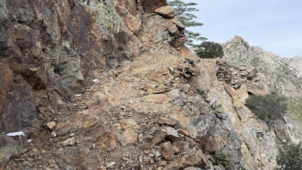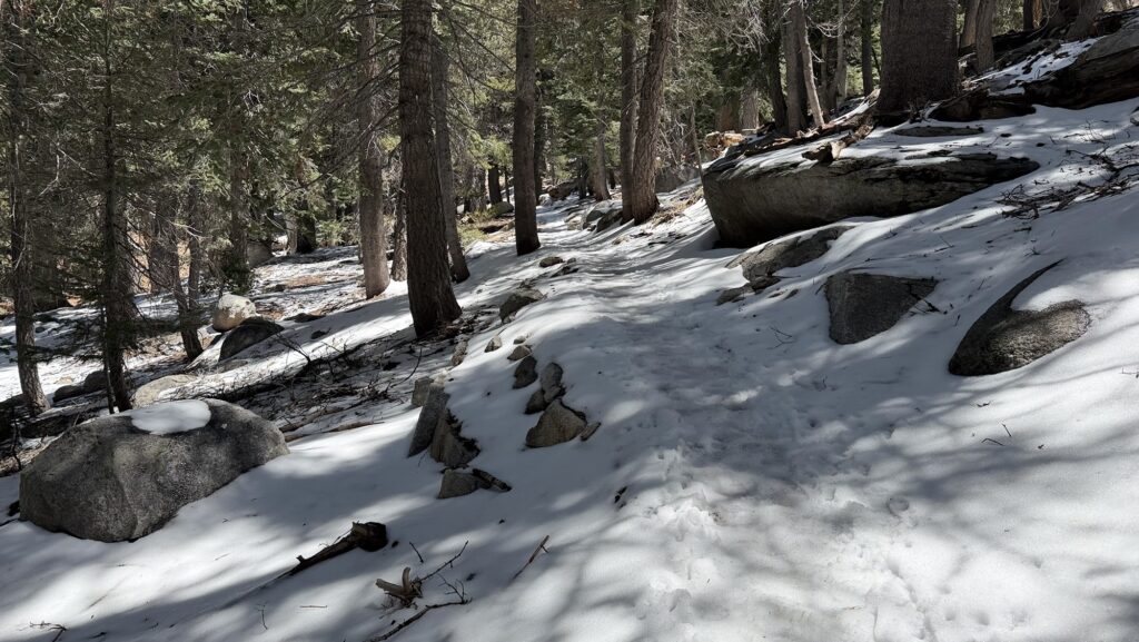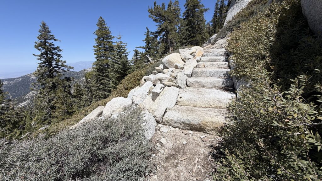 There was a point where a southbound set of older gentlemen were coming my way. I stood off to the side while they attempted a fresh rock slide and then pass me. The first man thought one of the rocks was stable. It was not. He fell directly to his ass. We looked at each other with an understanding of how that could have turned out. He was so close to sliding down the mountain.