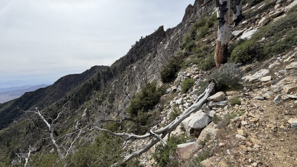 This is not the latest Konami code. It is how to travel from mile 151 (Paradise Valley Cafe) -> mile 209 (Cabazon).  The first two days lull you into a false sense of security. “Oh, this climb isn’t terrible.” 500 feet gain here, 500 feet loss there. No big deal. Day three, there is a long ascent up of 3,000ft. In it, there is a sketchy section of five miles that has old and fresh rock slides. This five miles also allows a 8-12” wide technical terrain of trail. One side is a cliff up, the other side a cliff down.